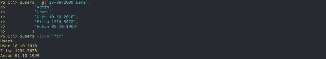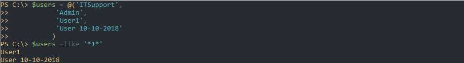 Сам параметр Like не относится к регулярным выражениям, но он позволяет искать по маскам (wildcard). Когда мы указываем знак звездочки ‘*’ мы говорим, что в этой части может быть неограниченное количество символов. В нашем случае ‘*1*’ говорит, что слева и справа может находится неограниченное количество символов. Есть еще один параметр в виде знака вопроса ‘?’, который указывает на присутствие одного символа.