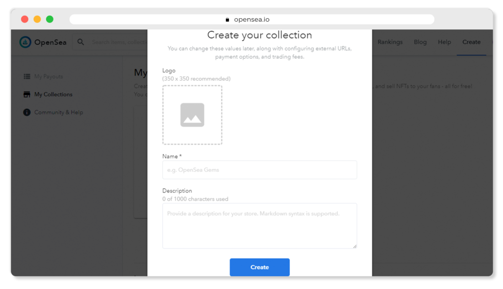 Далее OpenSea предложит выбрать логотип, название и описание для коллекции. Логотип и название — обязательные поля. Позже можно будет зайти в расширенные настройки и изменить эту информацию. Когда введем нужную информацию, нажимаем «Create».