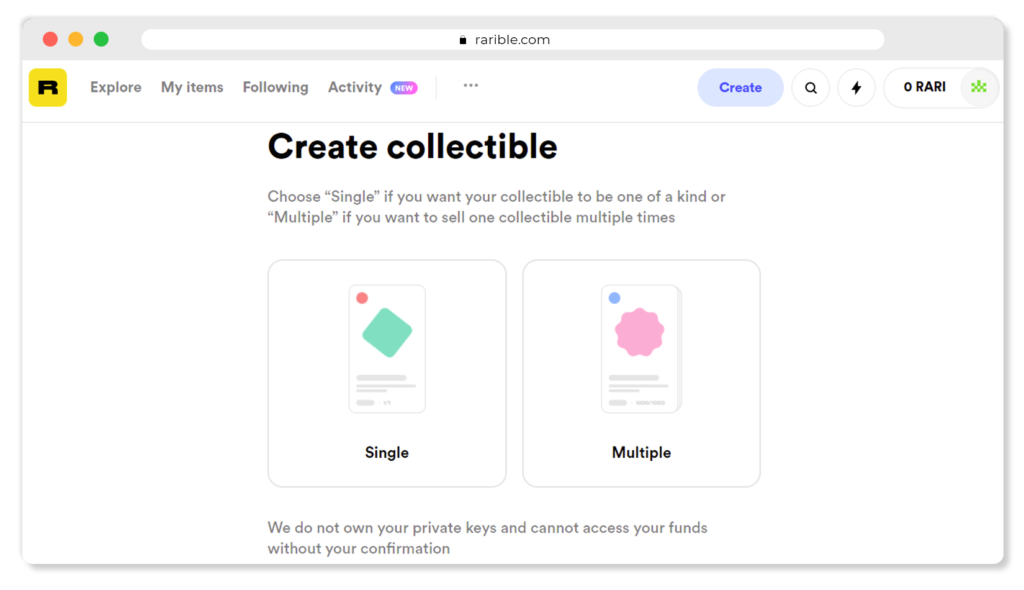 После того, как мы создадим коллекцию, сервис сразу предложит добавить предметы в нее предметы. То есть создать наш первый NFT. Именно это нам и нужно, поэтому нажимаем «Add Items».