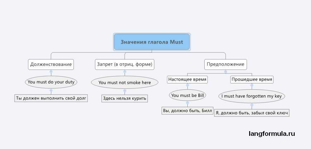 На практике зачастую трудно провести грань между долженствованием, приказом, настойчивым советом и просто советом. Но наиболее общее значение глагола must — долженствование. В этом значении must употребляется с глаголом в неопределенной форме.