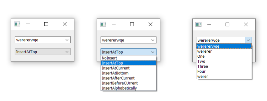 You can set a to be editable allowing the user to type enter the values not currently in the list. Entered values can be added to the list, or just used as a value which is not inserted. To enable editing you can call on the widget, while control of how inserts operate is handled through the insert policy. This is set by calling passing one of the following flags: