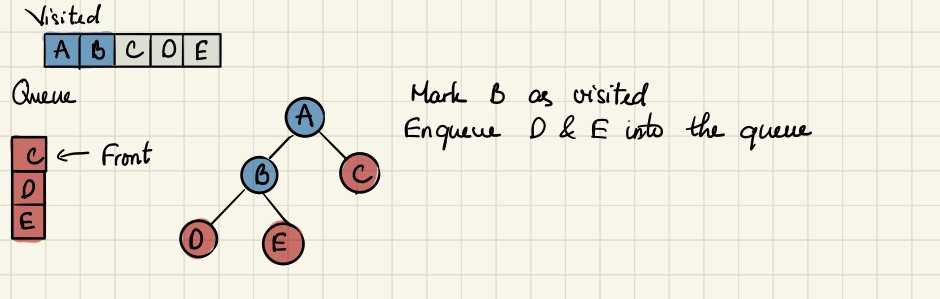 Далее мы отмечаем B как посещённый и добавляем в очередь его потомков — D и E.