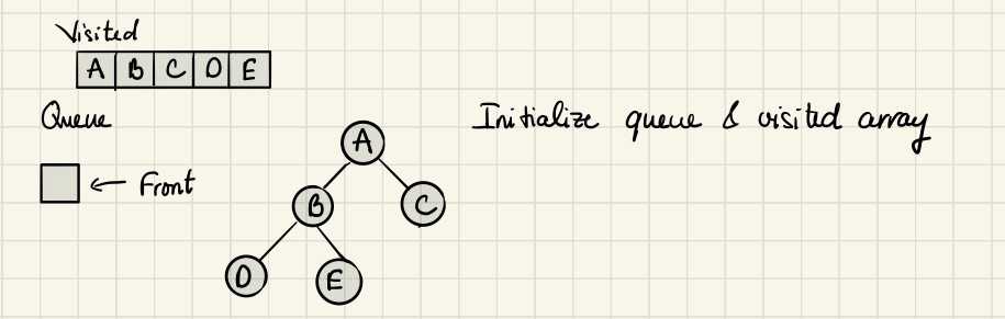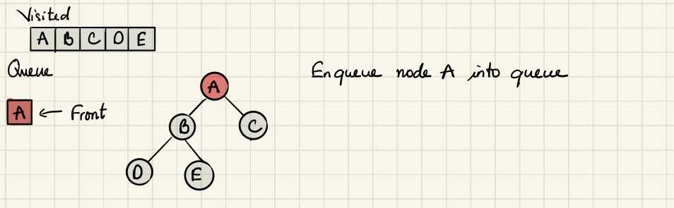 Посмотрим, как очереди помогут нам с реализацией BFS и увидим работу BFS в бинарном дереве. Начиная от исходного узла A, мы продолжаем по порядку исследовать ветки, а именно переходим сначала к B, а затем к C, на котором текущий уровень завершается. После мы спускаемся на следующий уровень и посещаем D, откуда следуем к E.