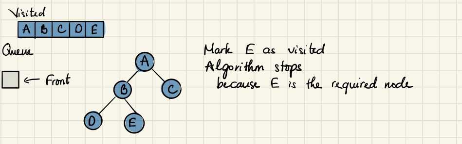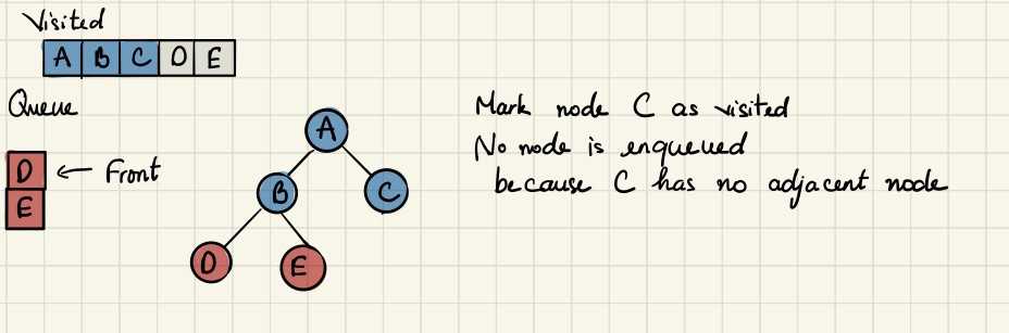 Далее, спустившись на уровень вниз, мы посещаем сначала D, а потом E, также продолжая убирать каждый посещаемый узел из очереди. Программа завершится, когда в очереди не останется элементов.