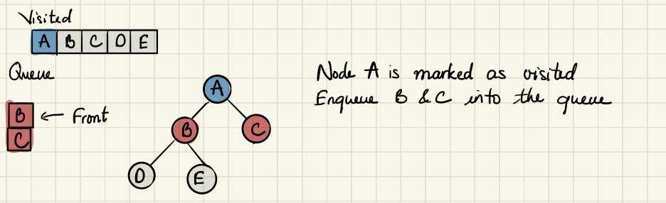 Отмечаем A как посещённый и переходим к смежным с ним непосещённым узлам. В данном примере это два узла — B и C, и мы добавляем их в очередь, следуя алфавитному порядку.