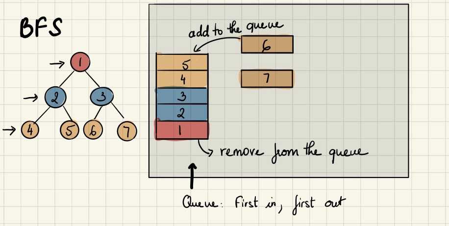 В этом подходе мы выполняем поиск по всем узлам дерева, создавая широкую сеть. Это означает, что сначала мы обходим один уровень потомков и лишь затем переходим к последующему уровню уже их потомков.
