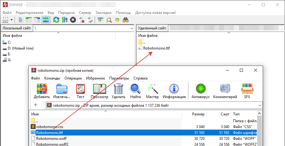 Открываем архив с моноширинным шрифтом и перетаскиваем в созданную папку на сайте,