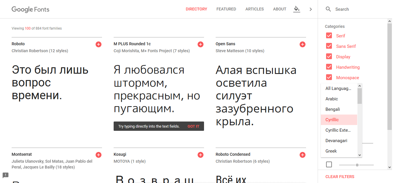 Во-первых, на сайте широкий выбор кириллических начертаний — сейчас доступны 492 шрифта на русском языке. Во-вторых, во вкладке Font Playground вы можете сверстать часть текста, настроить цвета, фон и проверить, как будет выглядеть ваш текст на сайте. В-третьих, у сервиса есть плагин для браузеров Chrome, Firefox, Яндекс.Браузер и Opera. С его помощью вы можете определить шрифт и кегль гарнитуры на сайте, не открывая код.