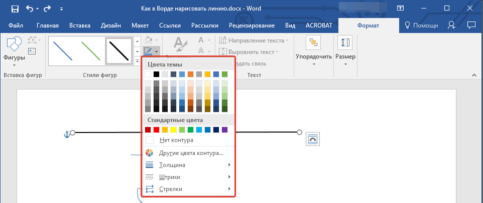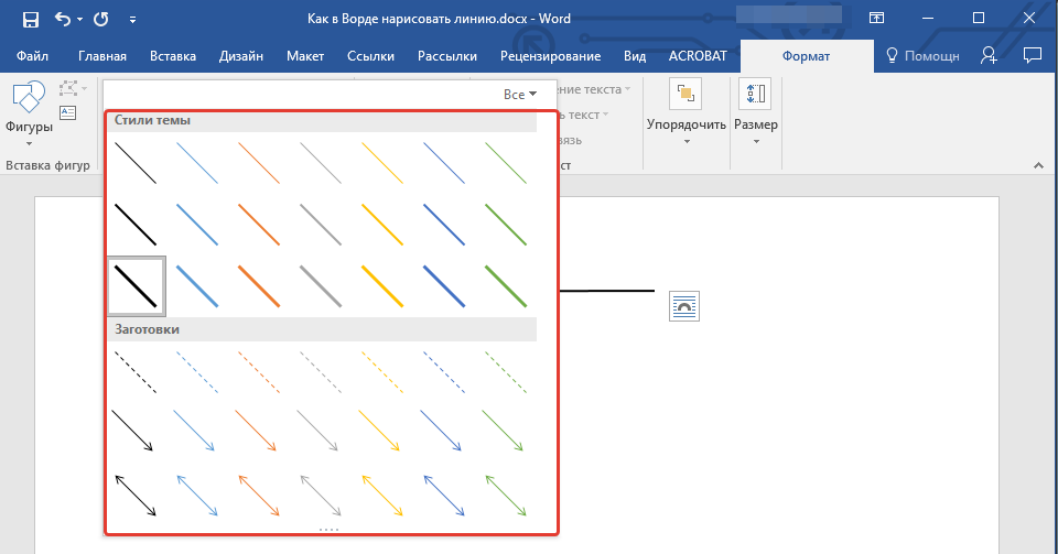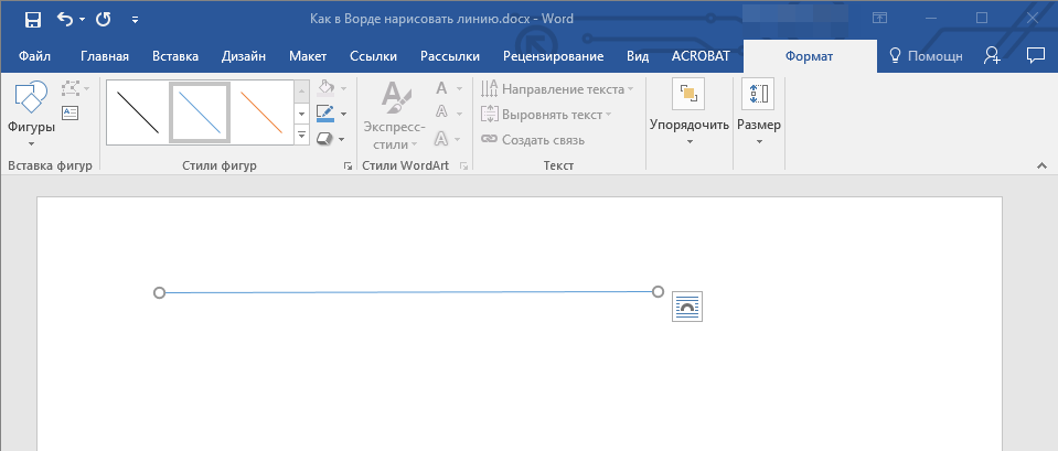 4. Линия заданной вами длины и направления будет нарисована. После этого в документе MS Word появится режим работы с фигурами, о возможностях которого читайте ниже.
