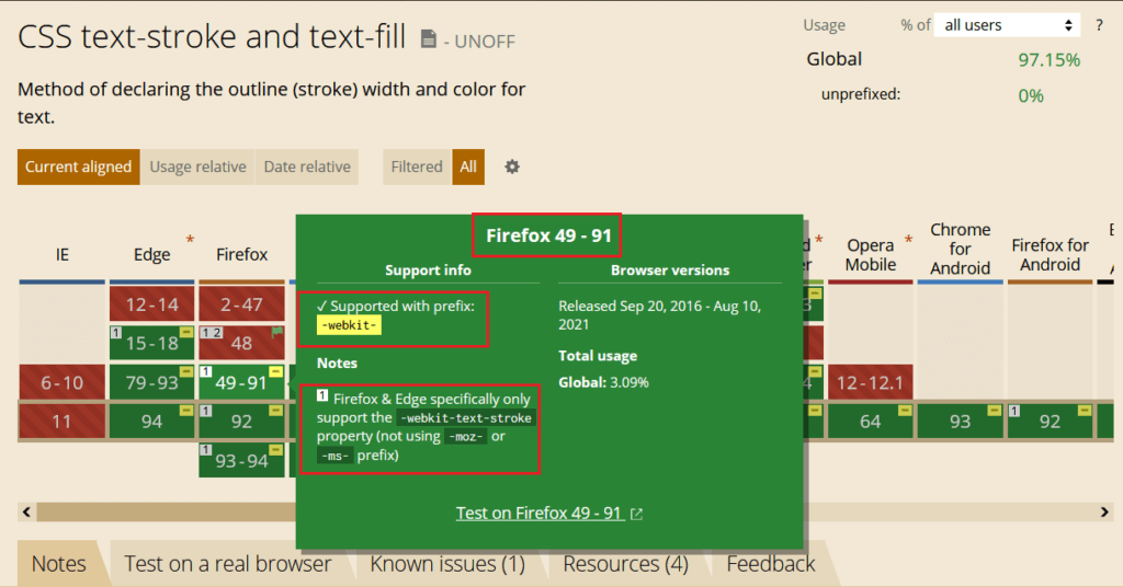 На данный момент свойство text-stroke является экспериментальным. В соответствии с названием оно позволяет задать контур для текста, который часто используют дизайнеры в таких программах, как Adobe Illustrator, Figma, Sketch или других приложениях для создания векторных изображений. В настоящее время свойство не включено ни в одну спецификацию W3C или WHATWG. При поиске этого свойства на MDN можно увидеть информацию только о свойстве , а также о составляющих его свойствах (ширина, или толщина контура) и (цвет контура), причем браузеры Mozilla Firefox, Opera и Microsoft Edge также поддерживают это свойство именно с префиксом , но не поддерживают пока без него.