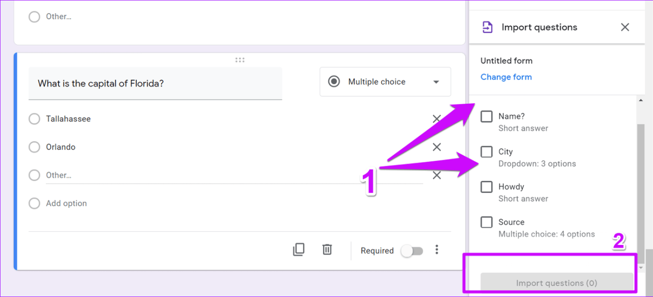 Выберите форму, из которой вы хотите импортировать, и все вопросы появятся на правой панели.
