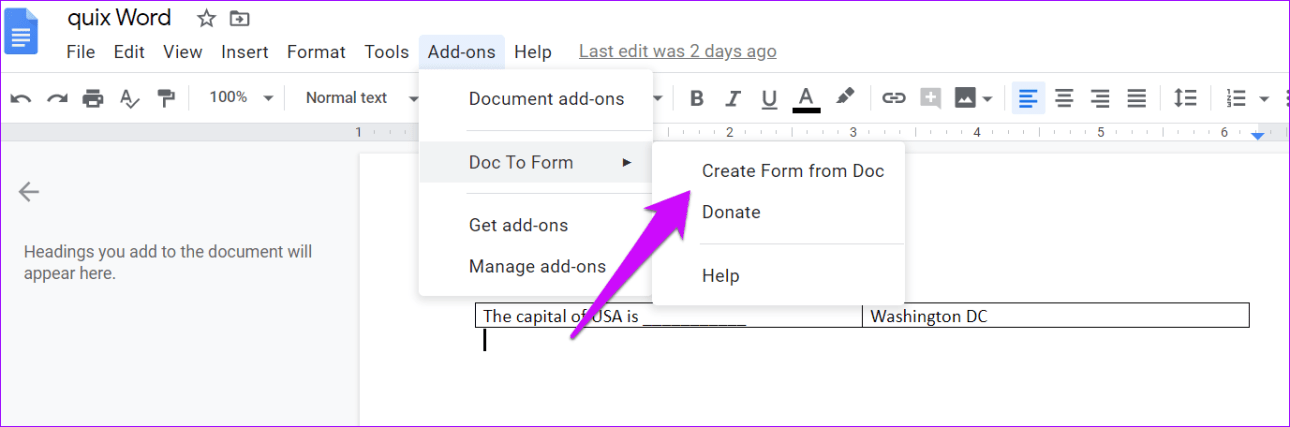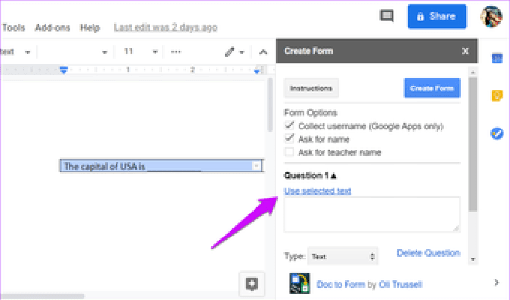 Шаг 2: После этого нажмите кнопку «Надстройка» и выберите «Документ в от»> «Создать форму из документа». Поскольку это дополнение предназначено в первую очередь для школьных учителей, вы увидите возможность добавить имя и имя учителя в форму.