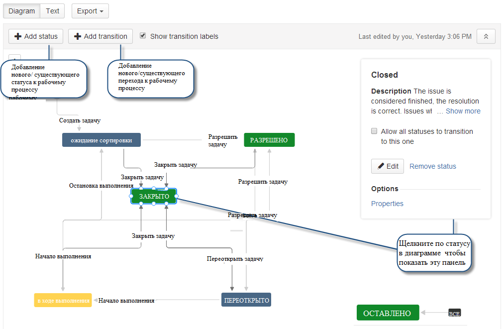 - Выбирать статус или переход, чтобы изменить его свойства, переименовать или удалять его (из рабочего процесса, но не JIRA), из панели свойств. Поскольку имена статусов хранятся на глобальном уровне, переименование одного из них сразу повлияет на все в JIRA, даже если черновик рабочего процесса не будет опубликован.