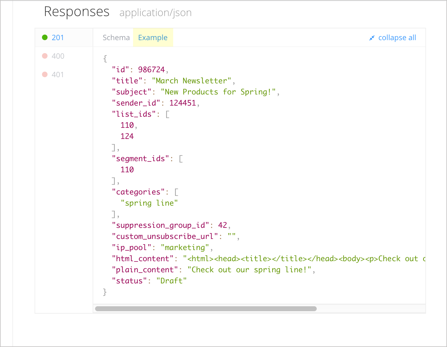 Такой подход облегчает поиск, а подход с всплывающими подсказками и раскрывающимся описанием позволяет сжать таблицу, чтобы можно было переходить к интересующим частям. Однако этот подход требует больше ручной работы с точки зрения документации. Тем не менее, для длинных объектов JSON, это может стоить того.