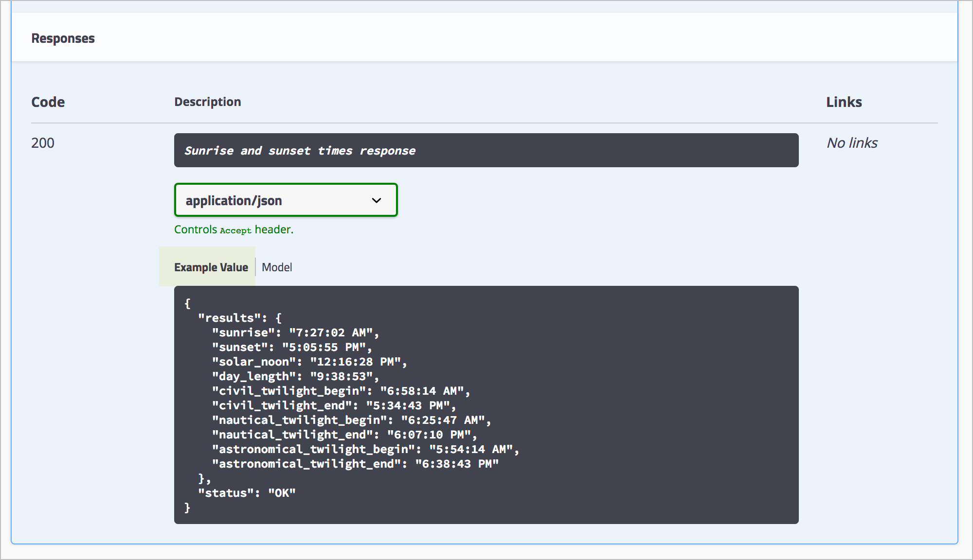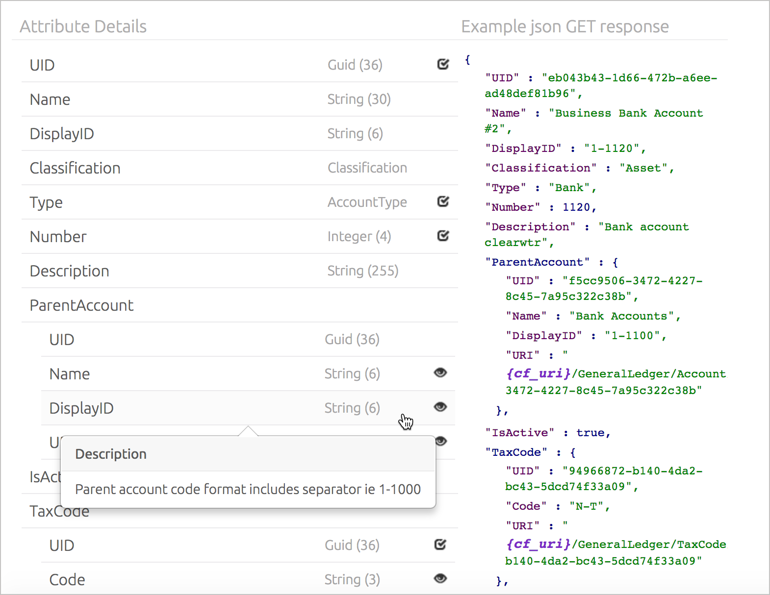 MYOB Developer Center использует интересный подход к документированию JSON в своих API. Они перечисляют структуру JSON в виде таблицы, с разными уровнями отступов. Можно навести курсор мыши на поле с для появления всплывающей подсказки с описанием или щелкнуть по полю, чтобы раскрыть описание ниже. Использование всплывающих подсказок позволяет идеально выровнять строки, содержащие пример и описание.
