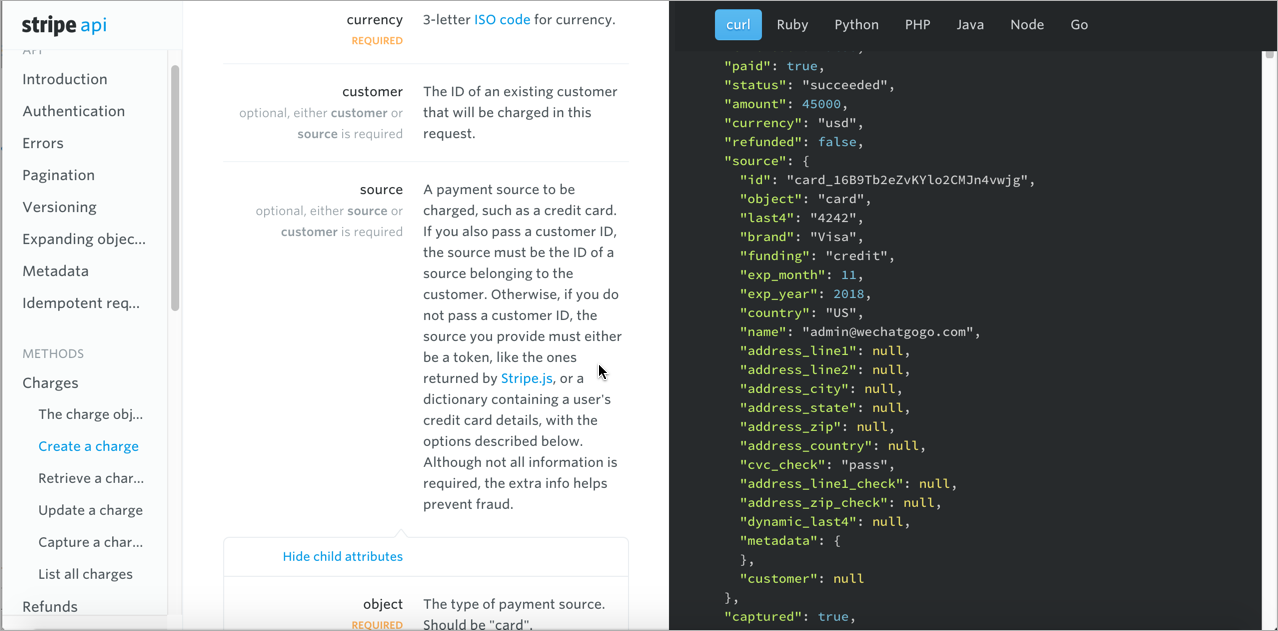 В дизайне Stripe образец ответа сопоставляется в правой части окна со схемой ответа в главном окне. Идея в том, что вы можете видеть и то и то одновременно. Описание не всегда совпадает с ответом, что может привести к путанице. Тем не менее, разделение примера ответа от схемы ответа в отдельных столбцах помогает различать их.