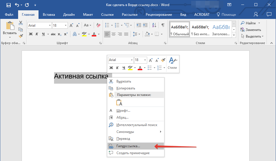 4. Кликните правой кнопкой мышки на выделенном объекте и выберите в контекстном меню пункт “Гиперссылка”.
