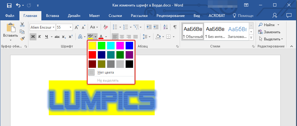 В группе “Шрифт” рядом с кнопкой, рассмотренной выше, находится кнопка “Цвет выделения текста”, с помощью которой можно изменить фон, на котором находится шрифт.
