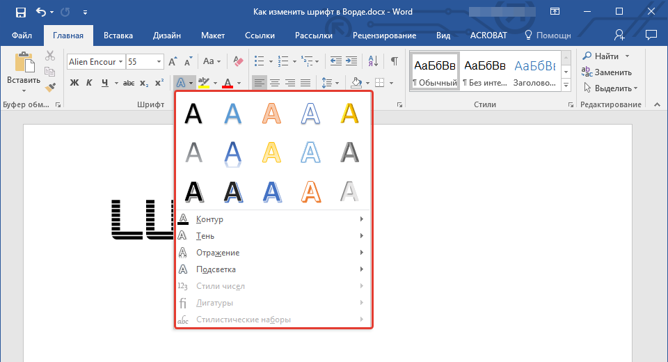 Чтобы изменить стиль шрифта, его оформление, в группе “Шрифт”, которая расположена во вкладке “Главная” (ранее “Формат” или “Разметка страницы”) нажмите на небольшой треугольник, расположенный справа от полупрозрачной буквы “А” (“Текстовые эффекты и оформление”).
