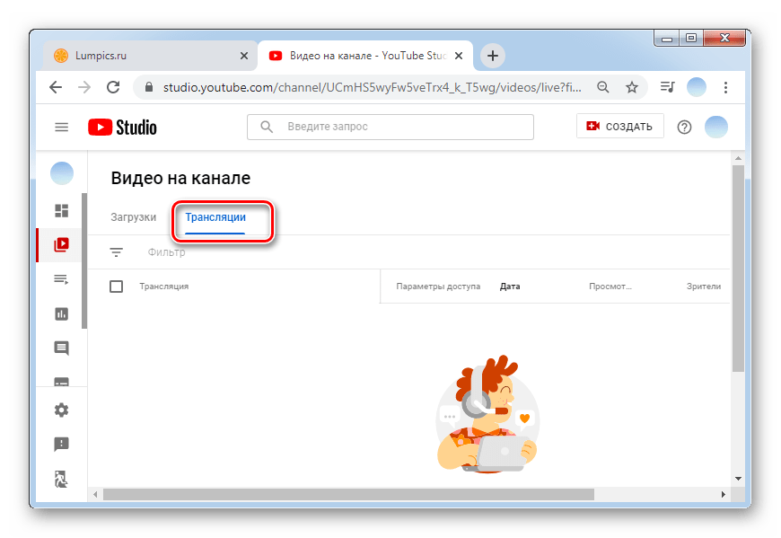 В категории «Видео» все разделено на две части: «Загруженные видео» и «Трансляции». Следует кликнуть на кнопку «Трансляции».