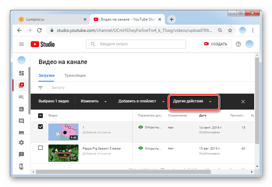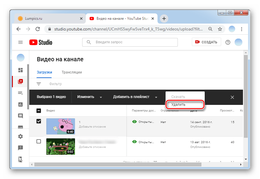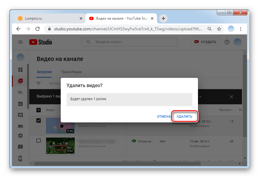 Удаление через эту вкладку в веб-обозревателе выполняется способом, идентичным описанному выше. Но, в отличие от него, здесь можно почистить не только отдельные ролики, но и сразу все, нажав на соответствующую кнопку в верхней части окна: