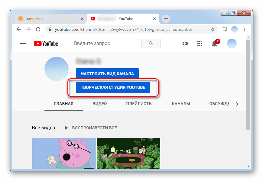 Кликаем по кнопке «Творческая студия YouTube». Именно здесь происходит редактирование вашего канала, удаление и добавление видео, а также просмотр статистики.