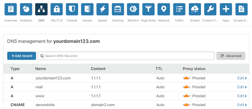 Делегирование DNS на серверы CF. Это обязательное требование работы с CF. Вы должны делегировать обслуживание доменного имени, которое использоваться совместно с CF на DNS-серверы компании. Впрочем, этот фактор может быть как преимуществом, поскольку DNS-серверы CF являются одними из лучших в своем классе, так и недостатком, если требуется «хитрое» управление зоной.