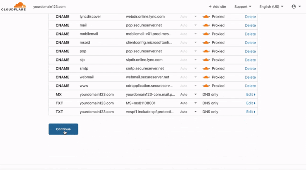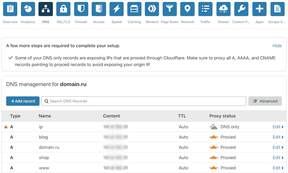 Cloudflare просканирует DNS-записи у вашего домена. Проверьте, все ли записи указаны и добавьте недостающие, если такие есть. В этом пункте вы сразу можете включить проксирование для всех записей.