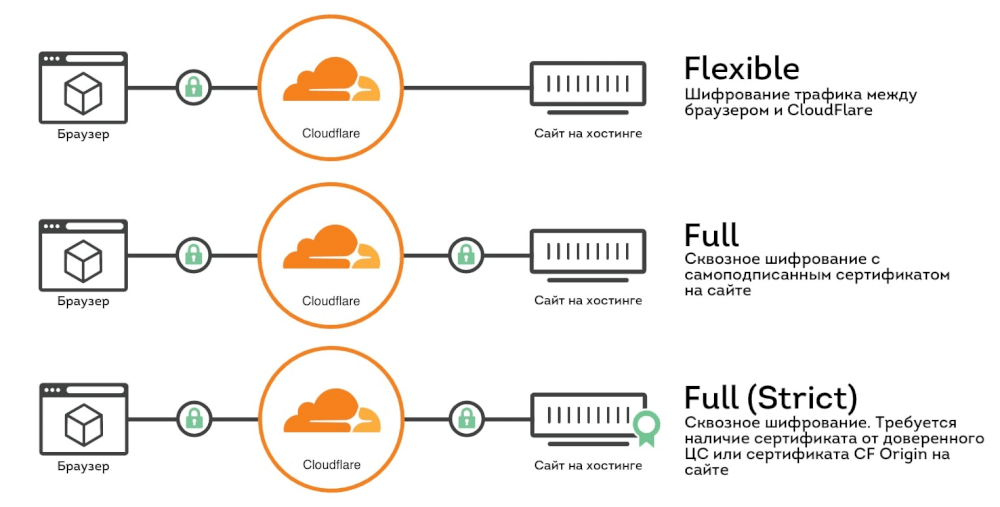При использовании проксирования от Cloudflare доступна настройка защищенного соединения для сайта в разных режимах: Flexible, Full или Full (Strict).