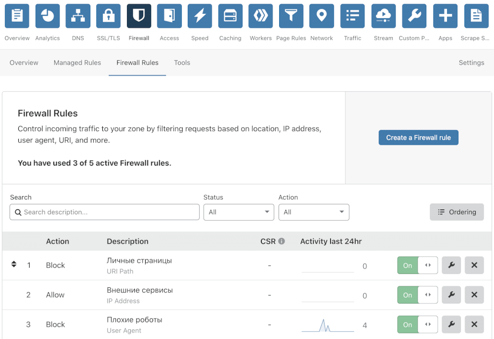 WAF — это правила, благодаря которым вы можете настроить дополнительную защиту для своего сайта. Правила настраиваются в разделе «Firewall» личного кабинета Cloudflare. Они позволяют блокировать запросы от нежелательных роботов, разрешать доступ к сайту для проверенных сервисов, настроить дополнительные проверки для роботов, и многое другое. Более подробно можно почитать об этом в инструкции на сайте компании.