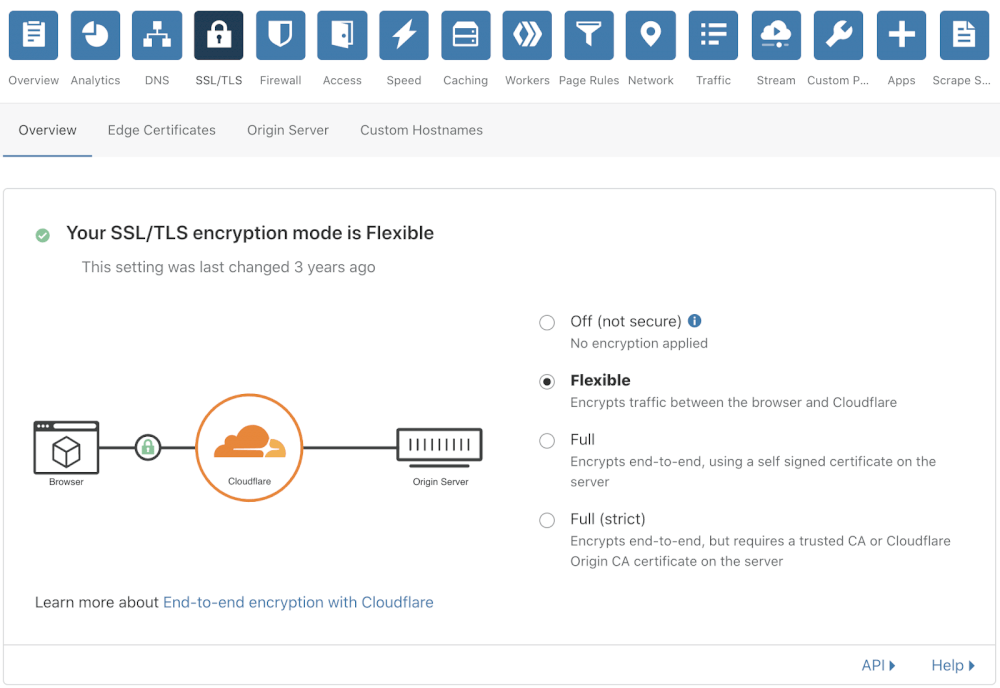 Режим «Flexible» шифрует трафик только между браузером и сервером Cloudflare