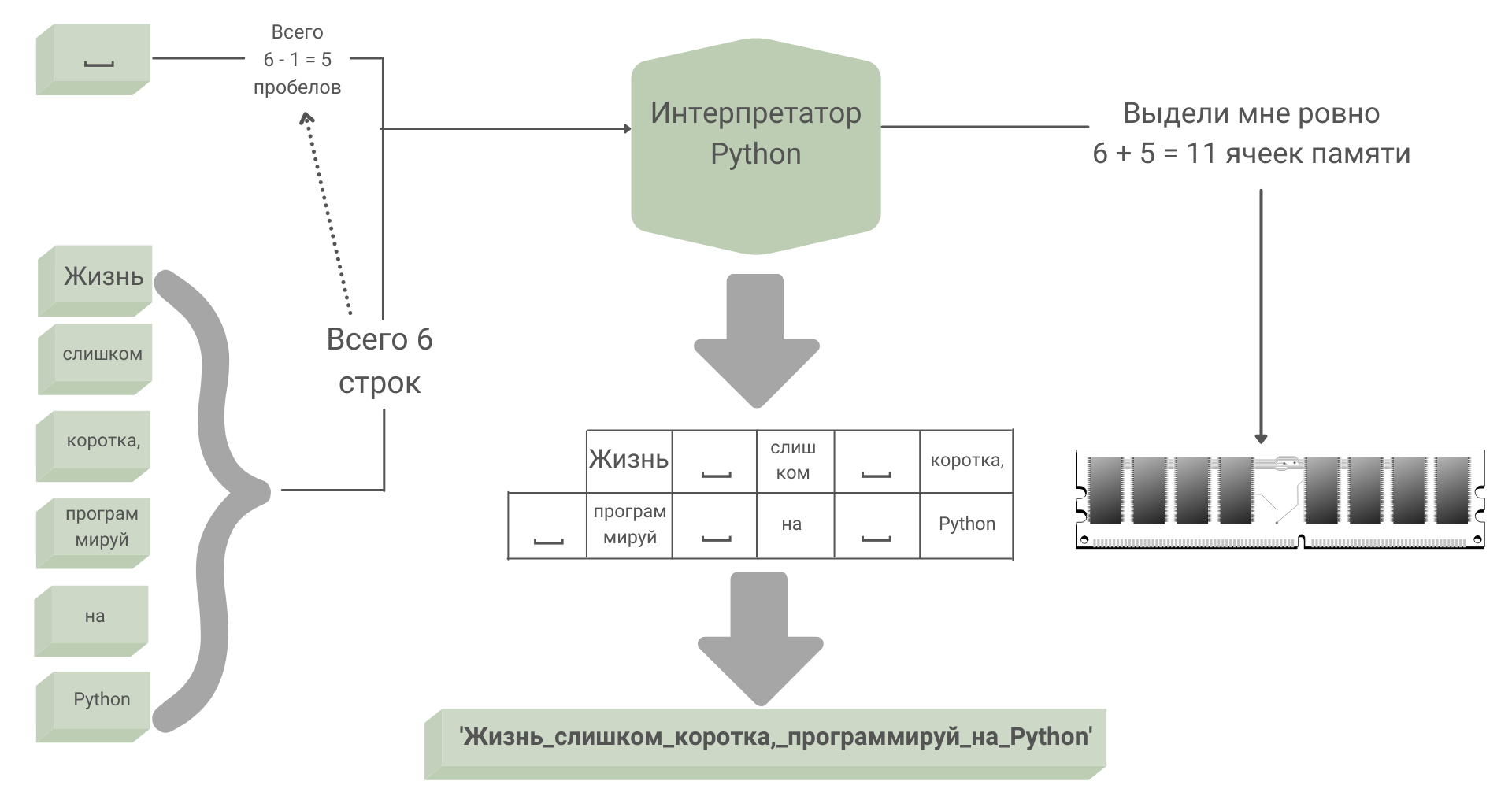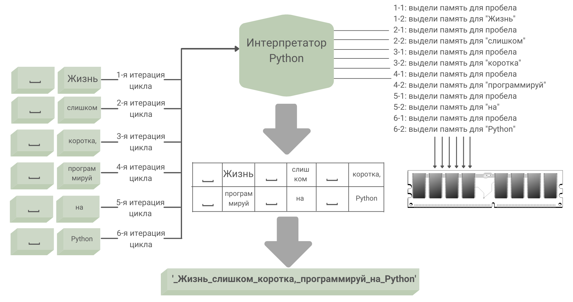 - Интерпретатор выполняет команду result += ‘ ‘ + s, сначала запрашивая память для пробела ‘ ‘.