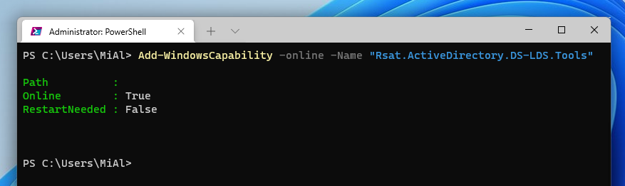 Add-WindowsCapability -online -Name "Rsat.ActiveDirectory.DS-LDS.Tools"