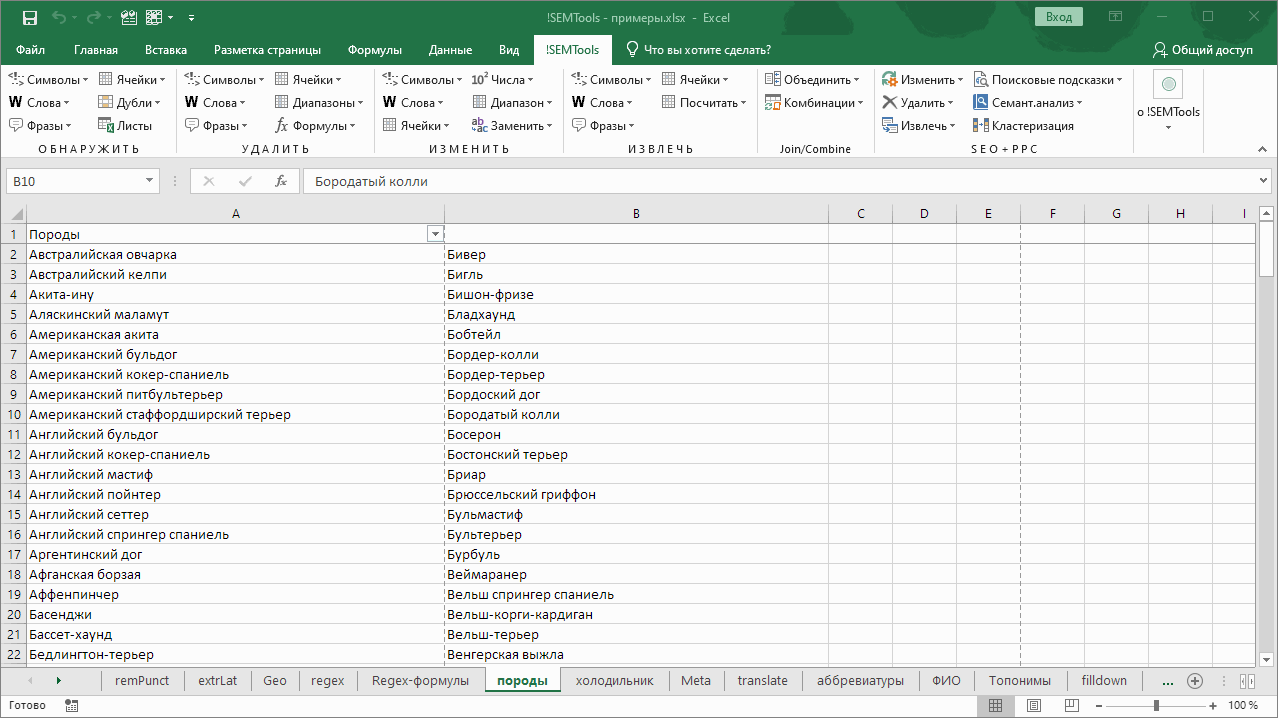 Для поддержки регулярных выражений при наличии подключенной надстройки !SEMTools в Excel будут работать 3 функции — REGEXMATCH, REGEXEXTRACT и REGEXREPLACE.