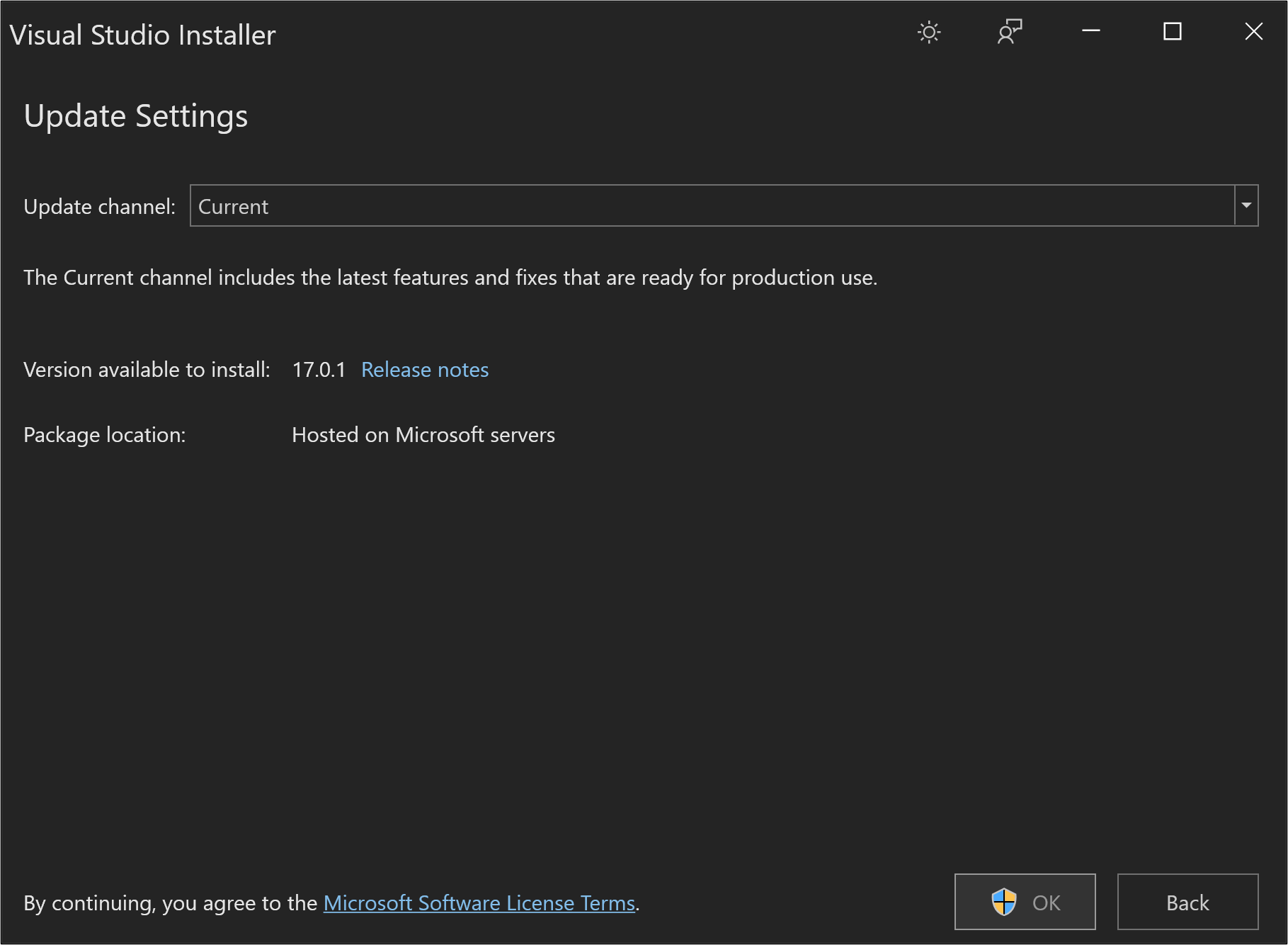 Диалоговое окно «Параметры обновления» также можно вызвать другим способом. Для этого откройте Visual Studio IDE, вызовите диалоговое окно «Доступно обновление» (нажав Просмотреть сведения в уведомлении об обновлении или Проверить наличие обновлений в меню «Справка»), а затем щелкните ссылку «Изменить параметры обновления».