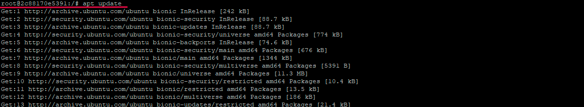 После этого можно запустить любую команду в контейнере. К примеру, можно обновить базу данных пакетов. Для этого нет необходимости пользоваться командой sudo, поскольку работа ведется от имени пользователя с root-правами: