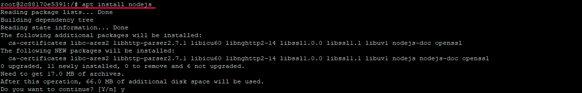 Эта команда выполнит установку Node.js в контейнер, используя репозиторий Ubuntu. По завершении установки можно проверить, была ли она успешно выполнена:
