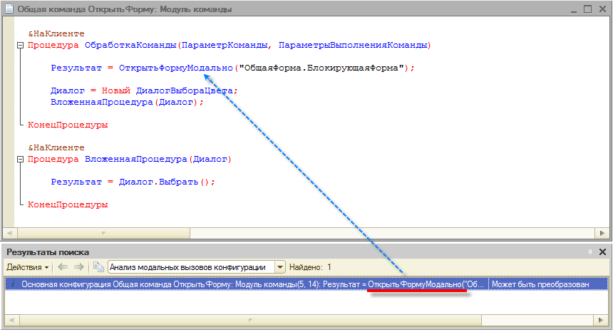 Нужно отметить, что эта проверка обнаруживает не все возможные модальные вызовы, а только те, которые можно определить «наверняка». То есть это модальные методы глобального контекста и модальные методы тех объектов, тип которых однозначно определён в анализируемом контексте.