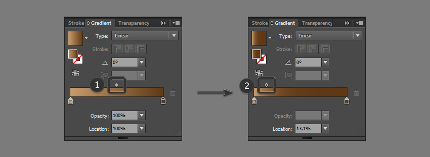 Чтобы отредактировать внешний вид градиента дальше, вы можете отрегулировать расположение средней точки (представленной значком ромба). Это определяет равномерное сочетание начального и конечного цветов. Для этого просто перетащите ромб влево или вправо.
