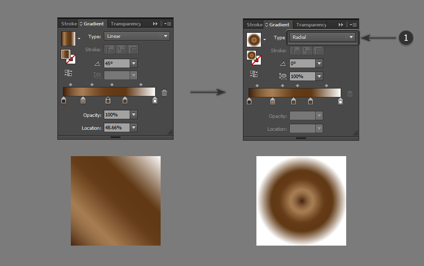 При первом щелчке на панели «Градиент» по умолчанию будет выбран градиент белого и черного цветов (или последний использованный градиент). Чтобы применить градиент к объекту, сначала выберите объект, к которому вы хотите применить градиент, нажав на него. Затем просто нажмите на Gradient Box или Gradient Bar внутри панели «Градиент» .