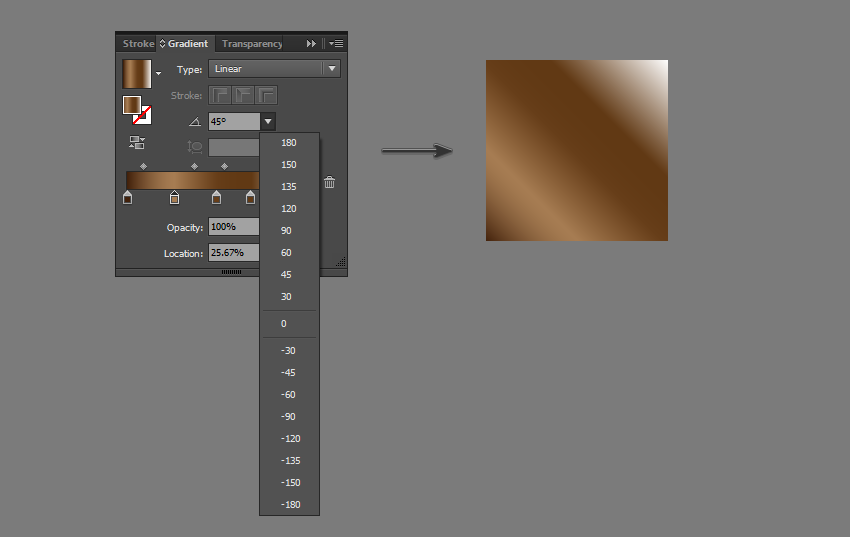 При использовании угла создаётся вертикальный градиент, идущий снизу вверх, создаёт горизонтальный градиент, идущий слева направо, и так далее по часовой стрелке. Отрицательные углы идут против часовой стрелки.