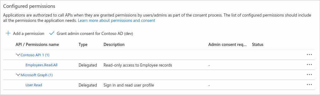 Если вы использовали примеры имен областей, указанные в предыдущем кратком руководстве, вы увидите имена Employees.Read.All и Employees.Write.All.