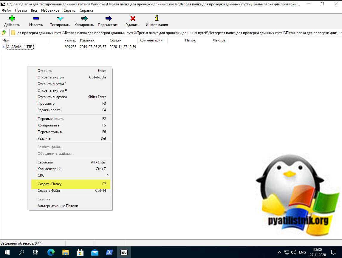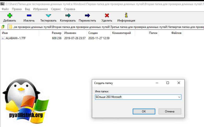 Наверняка многие знают архиватор 7Zip, но мало кто пользуется его файловым менеджером 7zFM.exe, а зря именно он может вам помочь в ситуации с сообщением «Слишком длинный целевой путь» или «Слишком длинный конечный путь». Вот у меня есть тестовая директория, у которой уже есть 260 символов в пути, и я не могу там создавать новую папку.