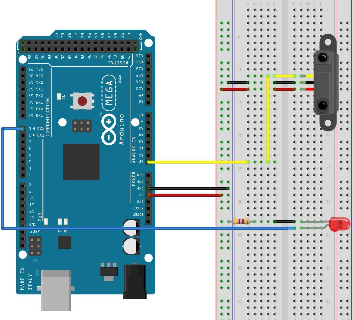 В этом эксперименте мы будем использовать датчик расстояния Sharp GP2Y0A21YK для управления яркостью светодиода.