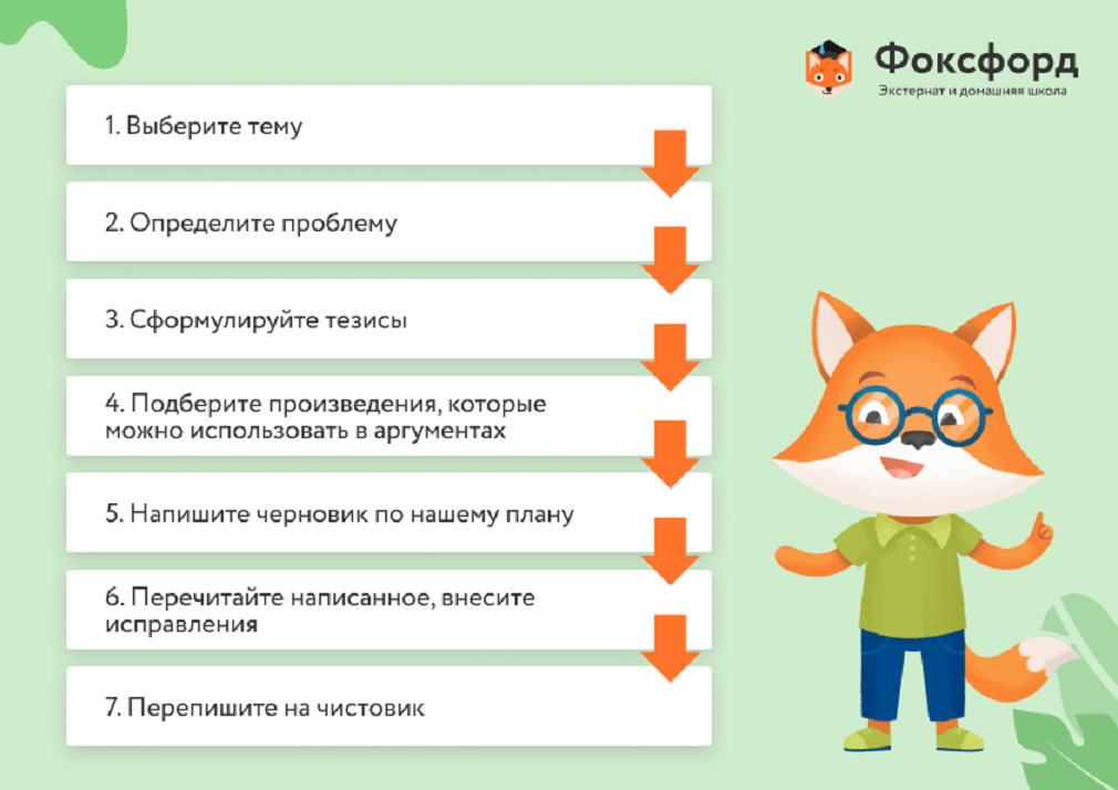 Для облегчения написания сочинений рекомендуем использовать план, который мы дали выше в статье — так одиннадцатиклассник точно не упустит важные вещи. Один из секретов, как написать хорошее итоговое сочинение, — придерживаться выверенной структуры и не нарушать логику повествования. Это умение приходит с практикой.