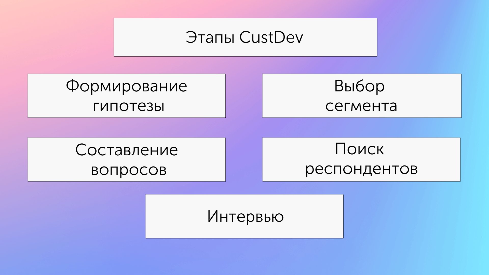 На основе исследований Customer Development разрабатывают новый продукт. Исследования включают пять шагов.