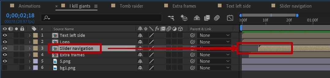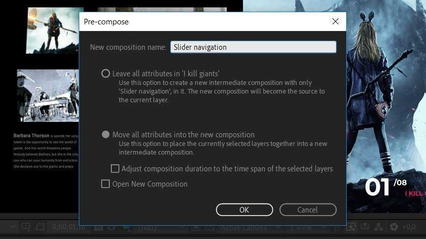 Теперь нужно добавить навигацию слайдера, меню-бургер и логотип. Перейдите в композицию I kill giants. Выберите слои буллетов слайдера, название фильма и порядковый номер слайда, а также их общее число. Объедините все слои в композицию Slider navigation.