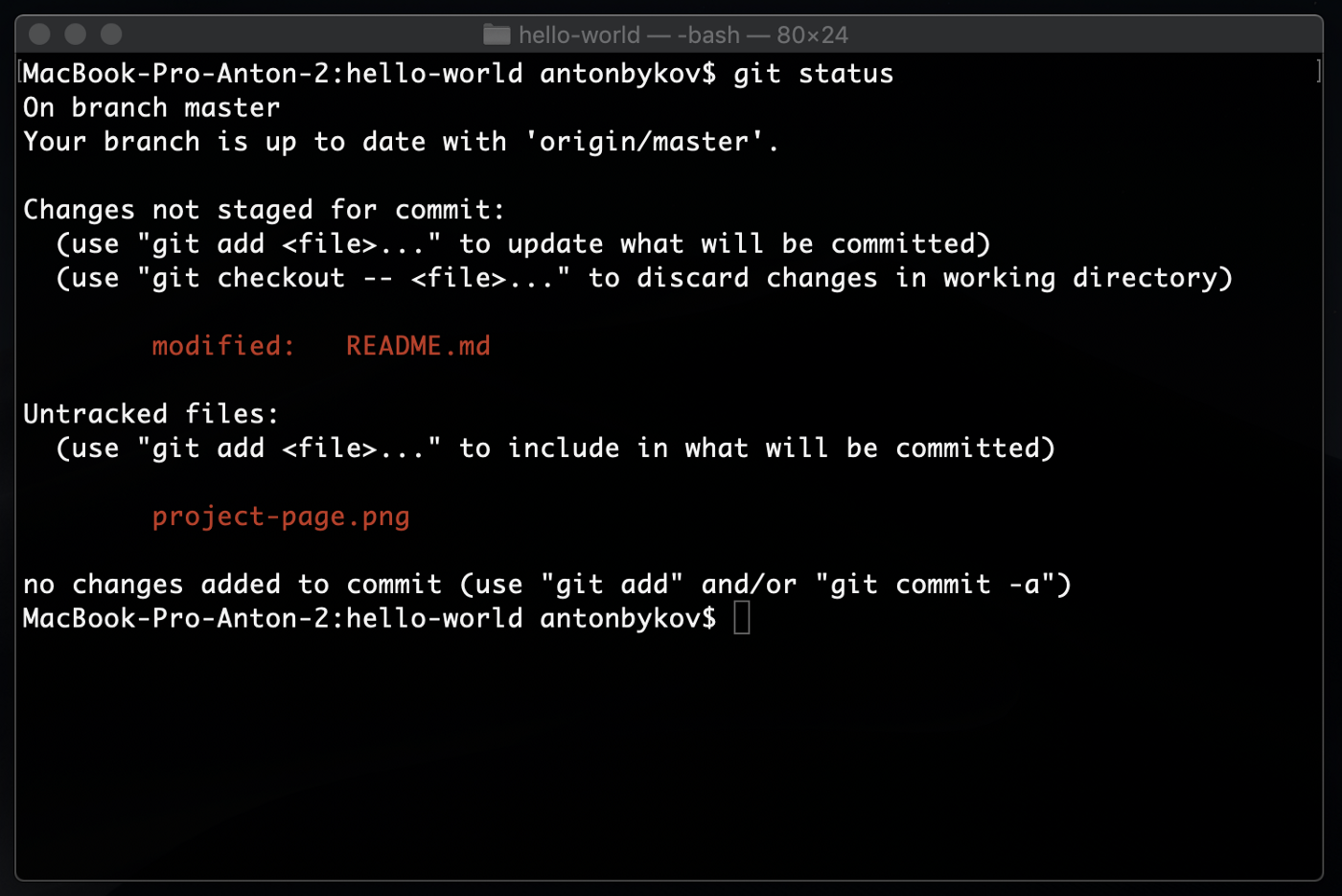 Просмотр информации об изменениях в проекте с помощью команды git status