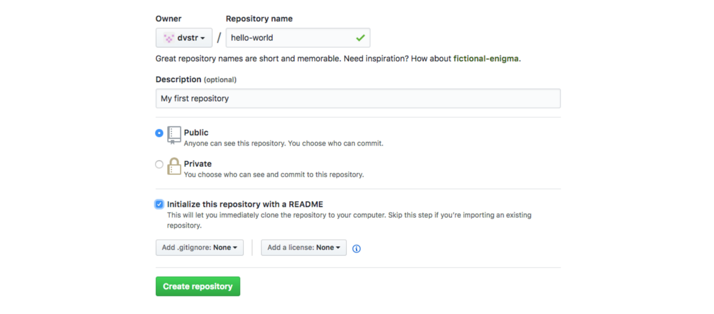 Важное замечание. При создании репозитория на GitHub лучше не ставить галочку в пункт где спрашивается про создание файлы README.md, иначе могут возникнуть проблемы при отправки локальных файлов в репозиторий.