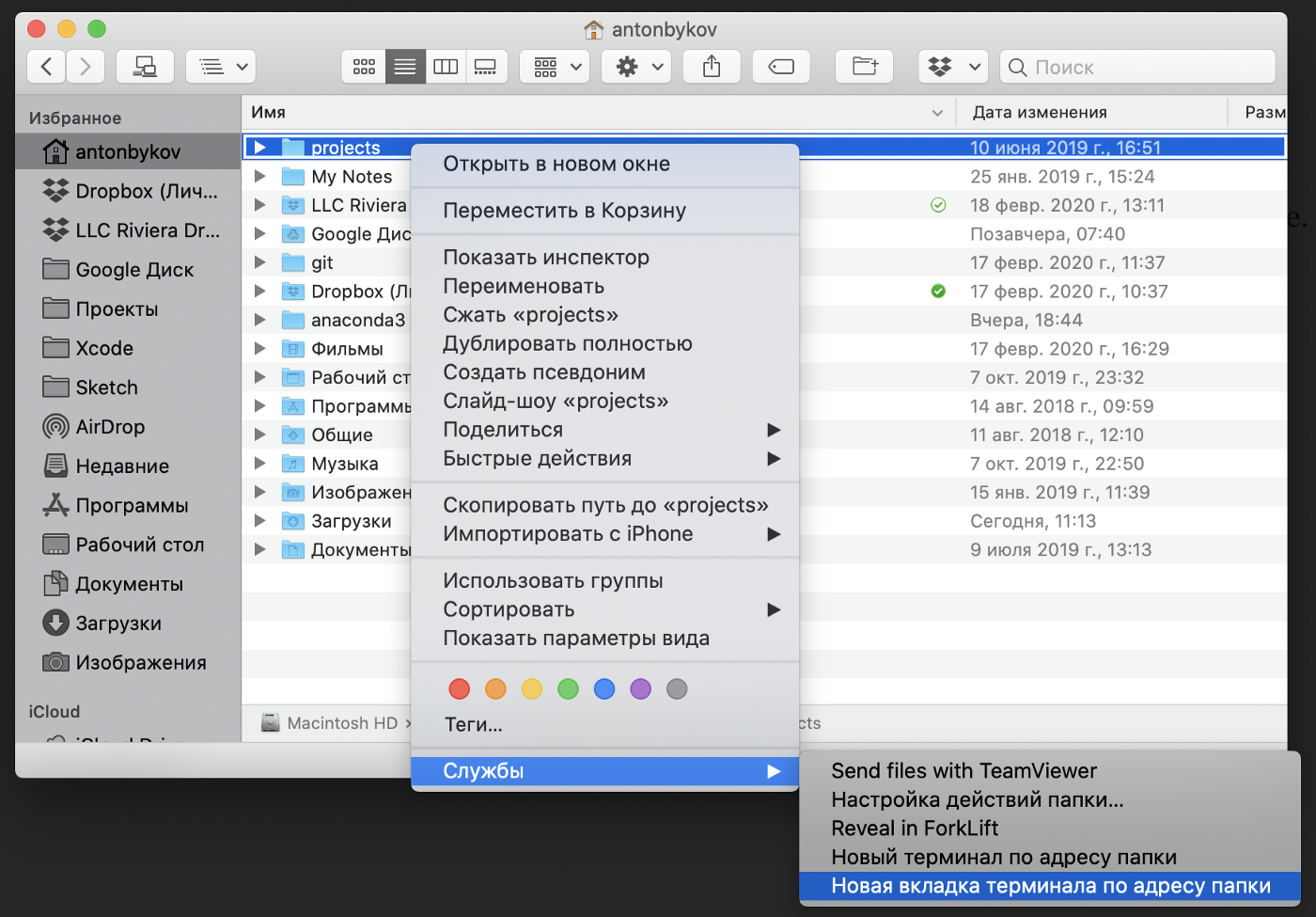На начальном этапе, работать с файлами и папками привычнее в Finder. Быстро перейти сразу в папку для проектов (после её создания) в Терминале, можно прямо из Finder, правым кликом по папке для проектов ⟶ Службы ⟶ Новая вкладка Терминала по адресу папки.